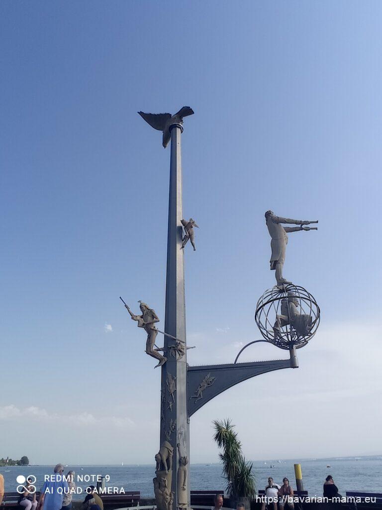 Spacerując po promenadzie siadłam pod jednym z symboli miasta, czyli pod magicznym filarem (niem. magische Säule) autorstwa artysty Petera Lenka. Autor przedstawił w trochę satyryczny sposób znane osobistości związane z miastem Meersburg czyli Amorem jest 13 wieczny biskup Freiherr Joseph von Laßberg, na zamkniętym w klatce globusie stoi uzdrowiciel i hipnotyzer Messmer. W klatce zamknięci są krytycy Messmera, naukowcy Maximilian Hell, Anton von Störck i Jan Ingenhousz. Kolejne postacie to baron Joseph von Laßberg, właścicielka winiarni szlachcianka Wendelgard von Halten, biskup Franz Konrad von Rodt i egzorcysta Johann Joseph Gassner. Na jednym z blogów znalazłam info właśnie o pannie Wendelgard, której akurat nie sfotografowałam i przytoczę tu cytat: “W kierunku jeziora patrzy szlachetnie urodzona panna Wendelgard, posiadaczka najlepszych lokalnych winnic w rejonie Haltnau. Niestety nie grzeszyła urodą,co bardzo przekładało się na jej życie osobiste i stosunki ze społecznością lokalną. Mówiło się o niej, że w samotności jadała ze swego srebrnego koryta.Pewnego razu postanowiła przekazać władzom Meersburga swój majątek, pod warunkiem, że podczas posiłku będą towarzyszyli jej radni miasta, a w każdą niedzielę któryś z nich będzie spędzał z nią czas i żegnał pocałunkiem. Dla władz, cena okazała się zbyt wysoka, jednak ofertą zainteresowali się sąsiedzi, zasiadający w radzie Konstancji.” Na samej górze króluje mewa z twarzą pisarki Annette von Droste-Hülshoff.