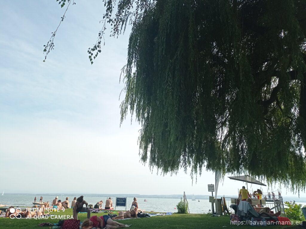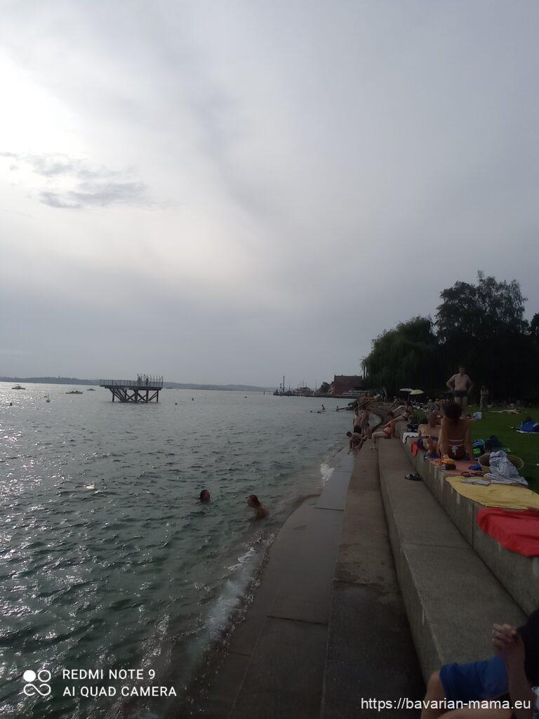 Szliśmy w kierunku miejskiej plaży (darmowa), jednak była ona bardzo mała i zejście było raczej kamieniste, więc poszliśmy dalej bo gdzieś dalej miała być plaża z otwartym basenem. Okazało się, że to były termy, bilet wstępu 5,50 E od osoby dorosłej, zapłaciliśmy i weszliśmy na dużo większą plaże niż ta obok, na której nawet byli ratownicy pilnujący aby osoby schodzące po schodach do wody nie poślizgnęły się. Niestety nie wykąpaliśmy się bo jadąc nad jezioro było upalnie ale akurat krótko przed wjechaniem do Meersburga zaczęło kropić i ochłodziło się a parkując pod gościńcem przywitała nas burza, która na szczęście szybko minęła, słońce co prawda wyszło ale nad jeziorem już wiatr był chłodniejszy, więc się nie odważyliśmy.