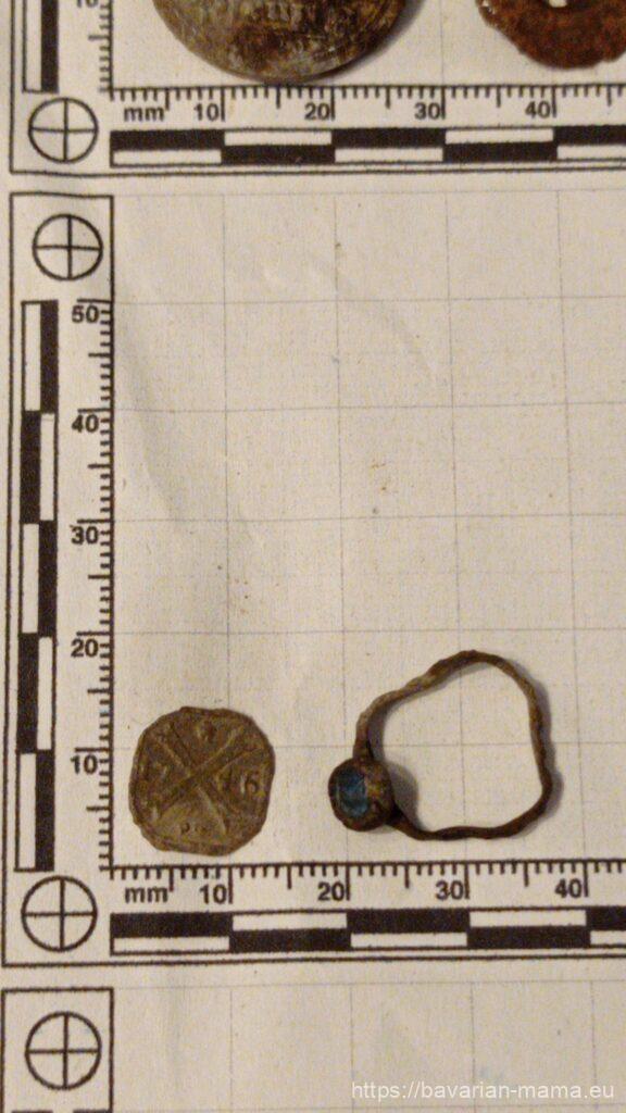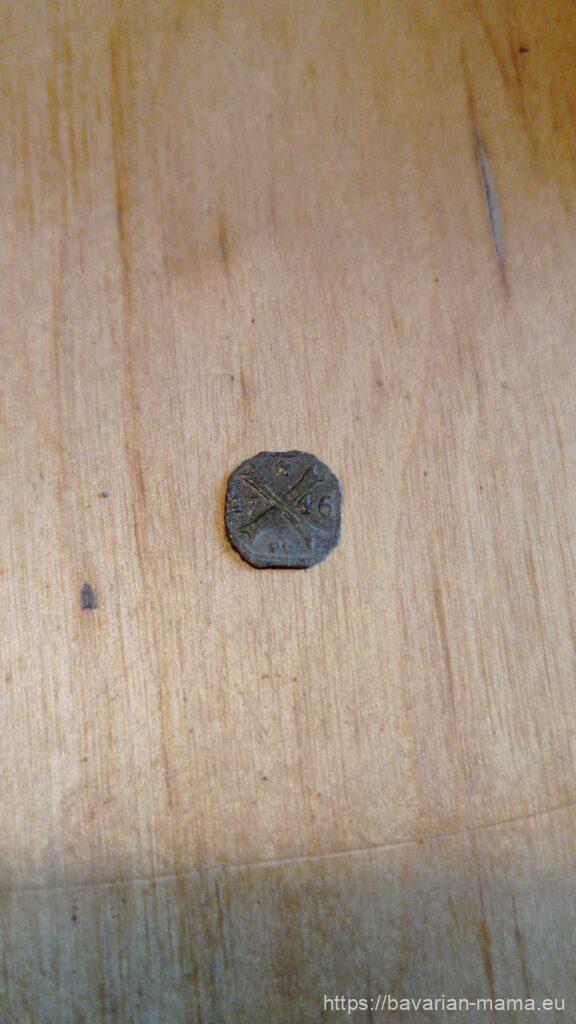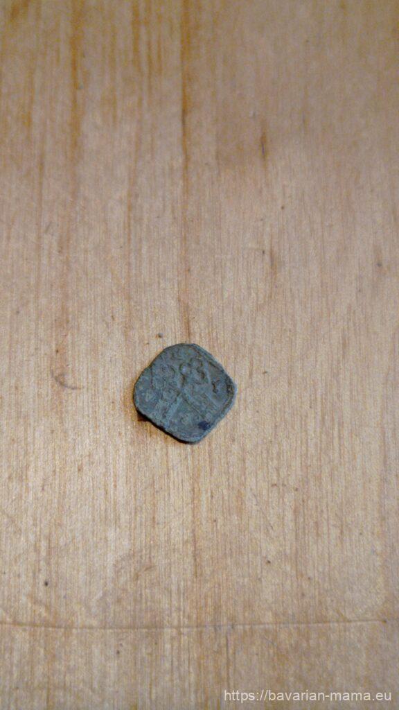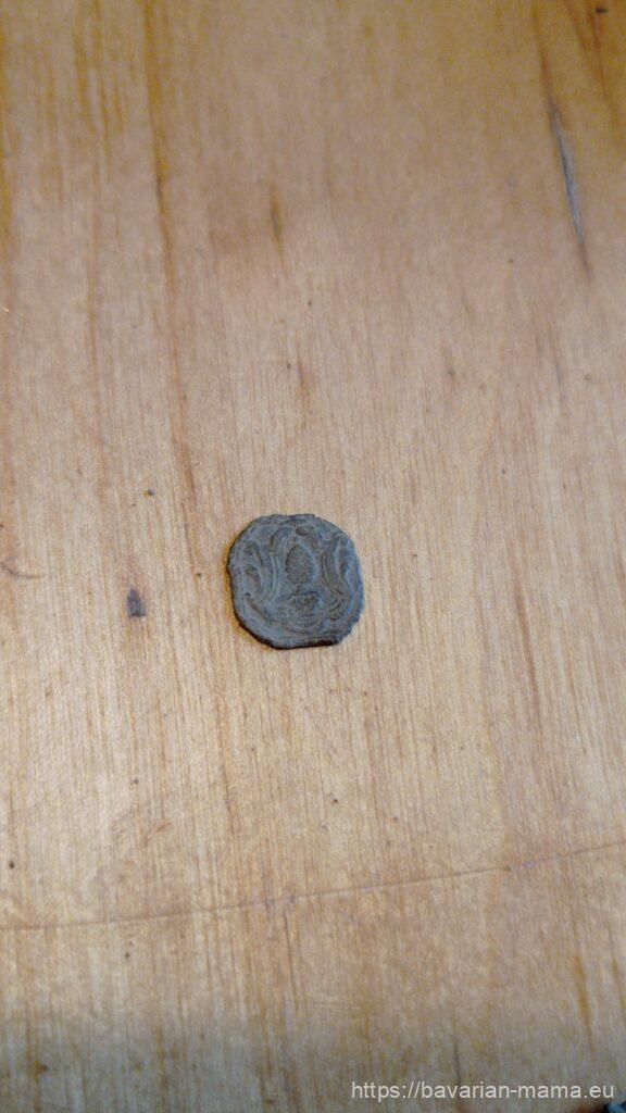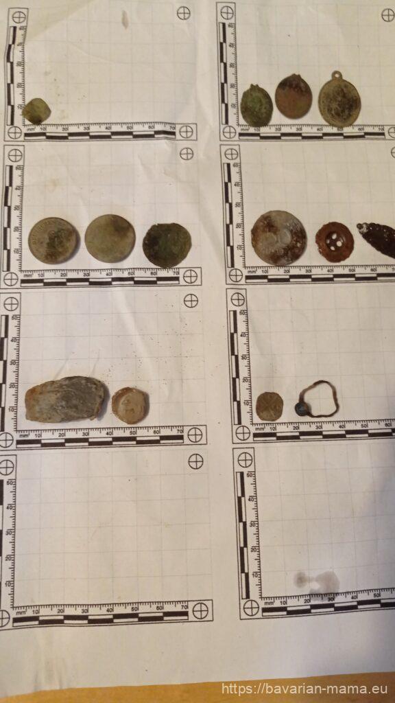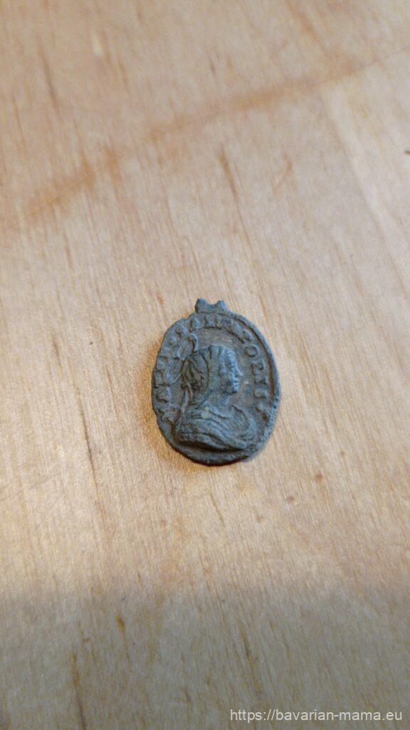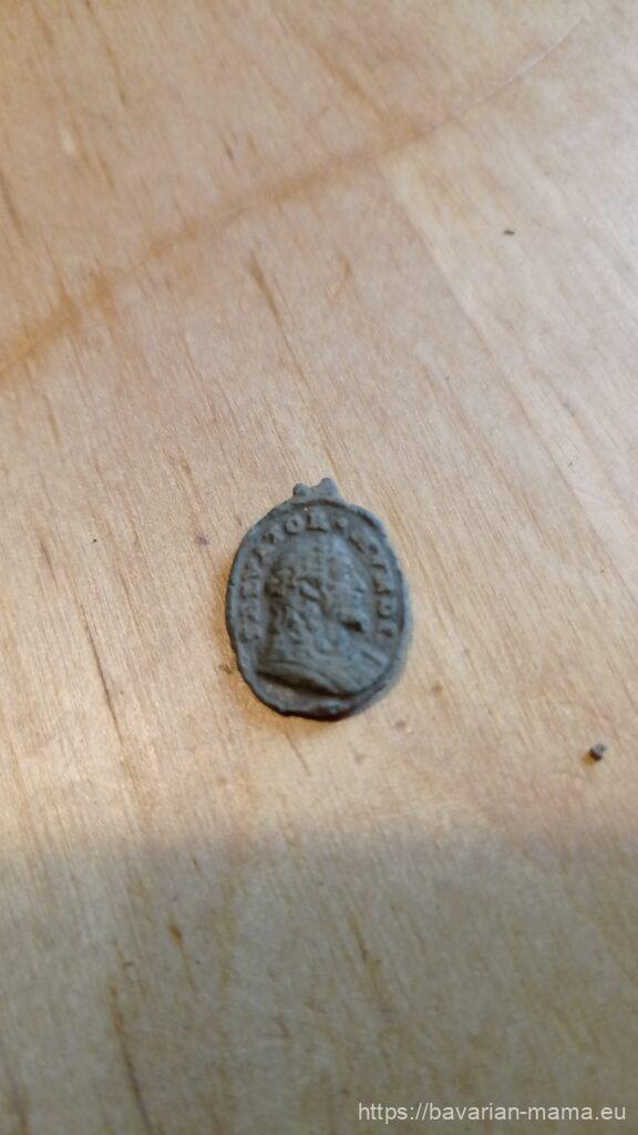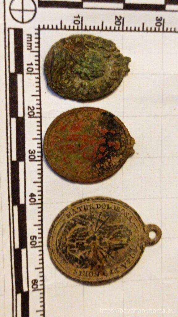 Niestety nie widać z jakiego roku pochodzi moneta. Kolejne rzeczy na jakie trafiałam, to kolejne monety, mniej lub bardziej zachowane i 3 sztuki medalików ze świętymi.
