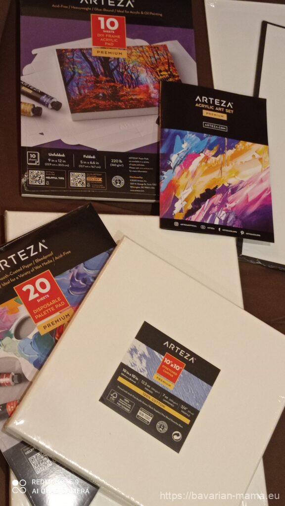Wczoraj był ostatni dzień szkoły i wreszcie ferie wielkanocne. Zabrałam córkę do atelier, w którym będzie mogła raz w tygodniu przychodzić na kursy malarskie. Niestety podczas pobytu tam, córkę zaczęło brać przeziębienie i dziś obudziła sie o 5.00 rano z gorączką. Zapisałam się z nią też na profesjonalny kurs malarski w weekend w mieście niedaleko nas ale skoro dostała gorączki, wiedziałam, że niestety będę musiała to odwołać i wybrać się z nią w innym terminie (o kursie później), dlatego żeby trochę poprawić jej humor, dałam jej już teraz prezent na święta. Wybrałam jej kuferek ze sztalugą oraz zestawem marki ARTEZA czyli farby, 5 pędzli, kilka kanw., papierowe palety do mieszania farb …